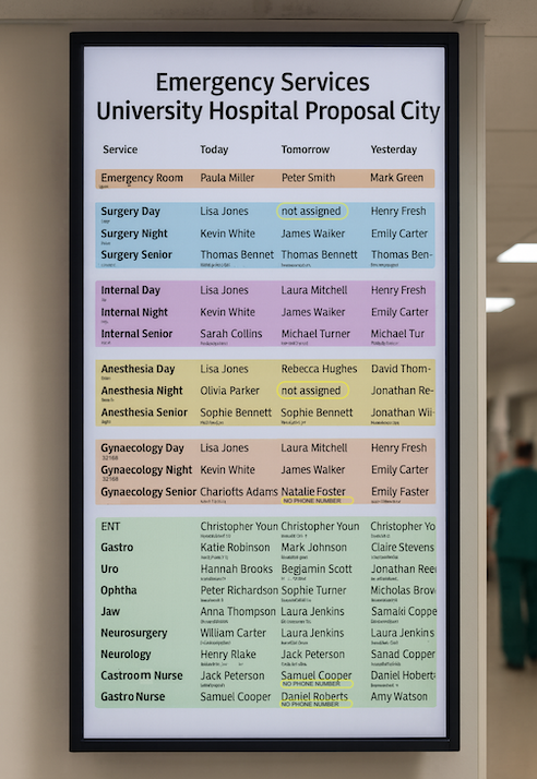 Essential Board is an intelligent digital staff-on-duty information screen designed for hospitals, providing a quick, automatically generated overview of duty rosters across multiple locations as needed. The system replaces manual on-call and standby rosters, handwritten notices, emails, and Excel spreadsheets with a modern, real-time, digital overview of on-duty physicians across all specialties.